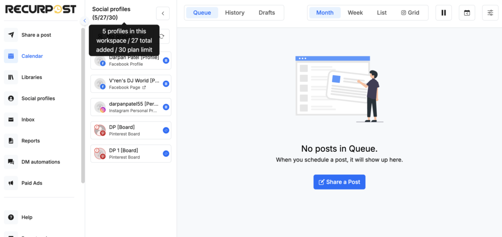 - Default Workspace – In the Default Workspace, you will be able to see all the social accounts and libraries you have in your RecurPost account.